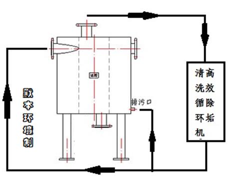 先將螺旋換熱器清洗介質(zhì)的進出口閥門關閉,再將冷介質(zhì)的進出口閥門關閉,排掉介質(zhì)。分別以冷熱介質(zhì)的進水排污口為清洗液進水口,出水排污口為清洗液出水口,按熱介質(zhì)進口—熱介質(zhì)出口—冷介質(zhì)進口—冷介質(zhì)出口的順序,和清洗泵、清洗槽、塑料管組成化學清洗循環(huán)系統(tǒng)