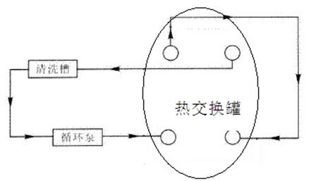 2、先將熱交換罐清洗介質(zhì)的進出口閥門關閉,再將冷介質(zhì)的進出口閥門關閉,排掉介質(zhì)。分別以冷熱介質(zhì)的進水排污口為清洗液進水口,出水排污口為清洗液出水口,按熱介質(zhì)進口—熱介質(zhì)出口—冷介質(zhì)進口—冷介質(zhì)出口的順序,和清洗泵、清洗槽、塑料管組成化學清洗循環(huán)系統(tǒng)和板式換熱器原理一樣,(如圖下所示)。